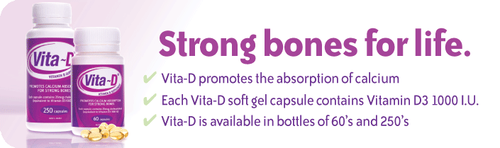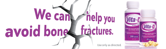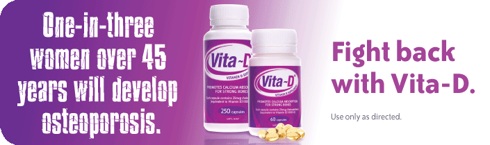 One-in-three women over 45 will develop osteoporosis, and this may lead to bone fractures. It gets worse. One-in-two women over 60 will develop a bone fracture due to osteoporosis. But you can fight back. Vita-D helps build strong bones and helps reduce the risk of falls and bone fractures. Ask your Pharmacist for Vita-D. |